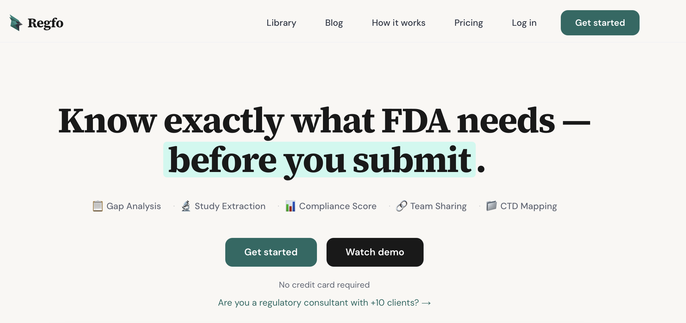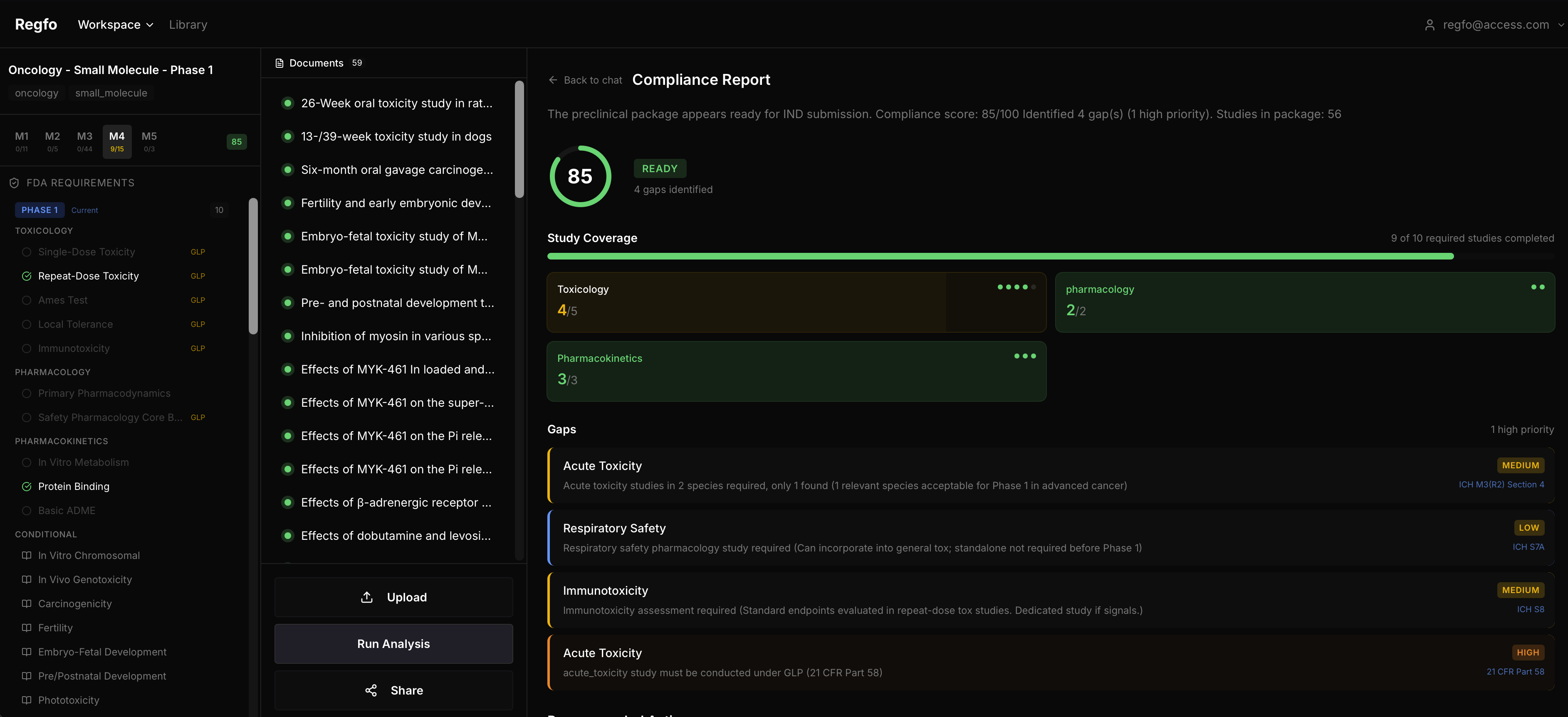 Regfo is a compliance checker. Upload your protocol or configure your study package, and it tells you what's missing according to FDA and ICH guidelines.